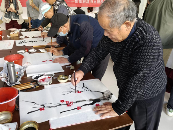 银发挥毫,尽显岁月沉淀的底蕴。老年大学的书画爱好者们凝神静气,落笔间力透纸背:“锦绣山河”四字遒劲挺拔,尽显山河壮阔;“江山如画”水墨氤氲,勾勒诗意意境。每一笔顿挫、每一划转折,都藏着半生的文化积累与人生智慧。他们还现场示范创作,细致讲解中锋运笔的稳健、侧锋勾勒的灵动,娓娓道来留白艺术中的东方美学,让在场学子深受启发。