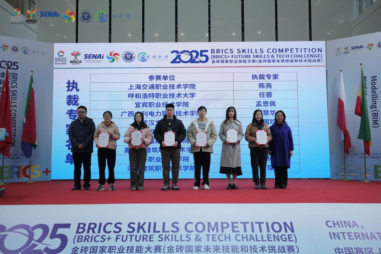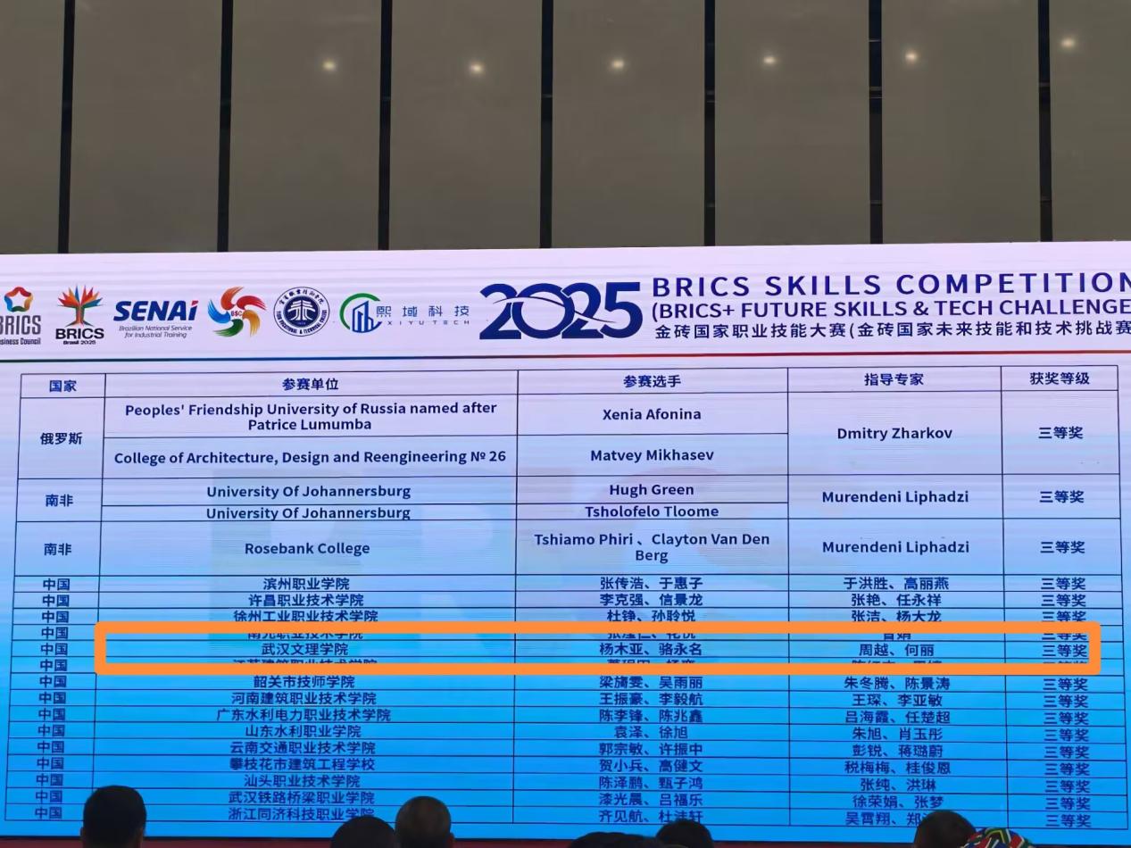 12月8日,2025金砖国家职业技能大赛(金砖国家未来技能和技术挑战赛)建筑信息建模赛项国际总决赛在宜宾职业技术学院圆满落幕。武汉文理学院智能制造与无损检测学院学子杨木亚、骆永名组成的参赛团队,在指导老师周越、何丽的悉心指导下,与来自中国17个省市及哈萨克斯坦、俄罗斯、南非等5个国家的共计53支队伍同台竞技,凭借扎实的专业功底与默契的协作能力,最终斩获国际三等奖。带队老师陈国珍凭借深厚的行业积淀与专业的执裁素养,荣获大赛执裁专家称号,为校争光。