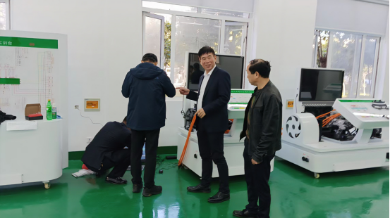 检查组一行实地察看了实验室功能分区布局、核心设备配置运行及安全管理落实情况,重点了解了动力电池检测、电驱动系统测试、整车性能仿真等实训模块的建设进度,详细询问了仪器设备使用率、实践教学适配度及校企协同育人机制建立情况。在现场交流中,杨灼芳认真听取了学院关于实验室建设规划、课程体系对接及评估指标达标推进情况的汇报,对学院聚焦新能源汽车产业发展需求、高标准推进实训平台建设的成效给予肯定。